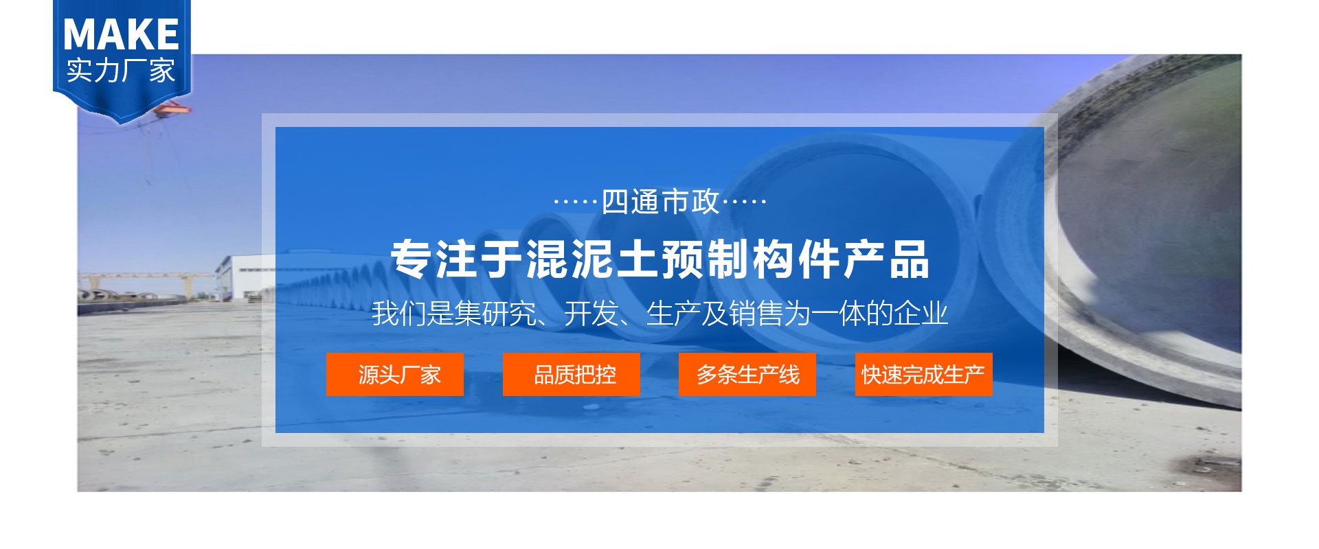 成都四通市政科技有限公司成立于2009年,注册资金2800万元,是一家专注于混泥土预制构件产品、水泥制品、高分子制品,球墨制品、塑料管件制品和市政道路 设施为一体的研究、开发、生产及销售的企业,公司技术和研发实力雄厚。公司自成立以来,始终坚持以 人才为本、诚信立业的经营原则,荟萃业界精英,将国内先进的生产设备、管理方 法及企业经验与国内企业的具体实际相结合,为企业提供全方位的解决方案,帮助 企业提高管理水平和生产能力,使企业在激烈的市场竞争中始终保持竞争力,实现 企业快速、稳定地发展。